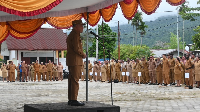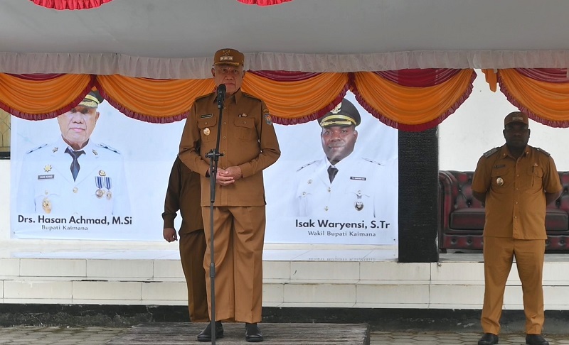 Bupati Kaimana Drs. Hasan Achmad, M.Si., memimpin Apel Perdana Aparatur Sipil Negara (ASN)  yang bertempat di Halaman Gedung Pertemuan Krooy Kaimana.