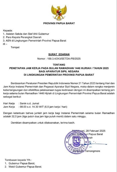 KOMINFO KAIMANA – Pemerintah Provinsi Papua Barat telah menetapkan jam kerja bagi Aparatur Sipil Negara (ASN) selama bulan Ramadan 1446 H. Berdasarkan Surat Edaran Sekretaris Daerah Nomor 100.3.4/243/SETDA-PB/2025, jam kerja ASN dimulai pukul 08.00 WIT hingga 14.30 WIT, atau 6,5 jam per hari, yang lebih singkat satu jam dibandingkan jam kerja normal sebagaimana tertera dalam surat edaran berikut: