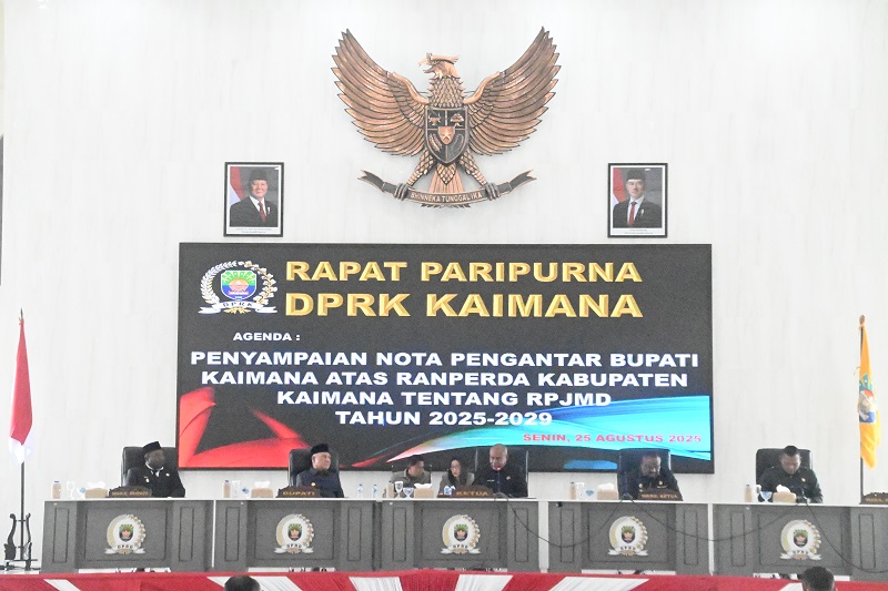 KOMINFO KAIMANA— Pemerintah Kabupaten Kaimana secara resmi menyampaikan Nota Pengantar atas Rancangan Peraturan Daerah (Ranperda) tentang Rencana Pembangunan Jangka Menengah Daerah (RPJMD) Kabupaten Kaimana Tahun 2025–2029 yang disampaikan oleh Bupati kaimana Drs. Hasan Achmad, M.Si., pada hari Senin (25/08/2025) dalam Rapat Paripurna DPRK Kaimana yang digelar di Ruang Auditorium DPRK Kaimana,